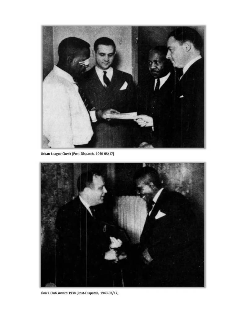 All of St. Louis was astounded by Louis Lee Baker’s incredible story of survival and public service. The Downtown Lion’s Club honored Mr. Baker with their Meritorious Service Award in 1938. Mayor Bernard Dickmann further rewarded him with a lifetime job on the city’s payroll at $100/month. And the Urban League collected $2,367 in donations from a grateful community.